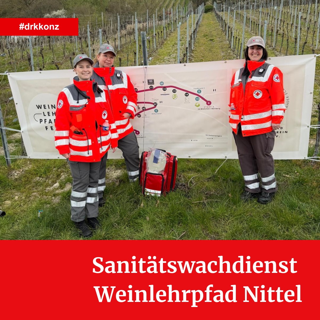 An Karsamstag waren vier unserer ehrenamtlichen Helferinnen und Helfer zur sanitätsdienstlichen Absicherung auf dem Weinlehrpfad in Nittel im Einsatz.Während einige, kleinere Wunden mit Pflastern versorgt werden konnten, musste eine Person mit dem Rettungsdienst zur Weiterbehandlung in ein Krankenhaus gebracht werden. Wir wünschen gute Besserung!
