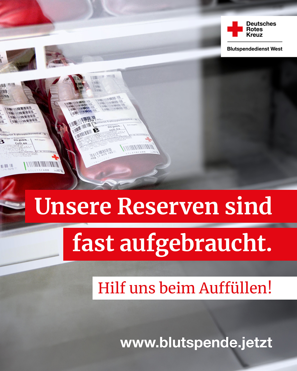 Aufgrund der derzeitigen Witterungsverhältnissen, den damit verbundenen Erkältungskrankheiten und den vergangenen Feiertagen und Urlaubszeiten ist die Versorgung mit Blutpräparaten kritisch. Bitte machen Sie von den nächsten Angeboten zur Blutspende Gebrauch. Terminvereinbarung unter www.blut... [mehr]
